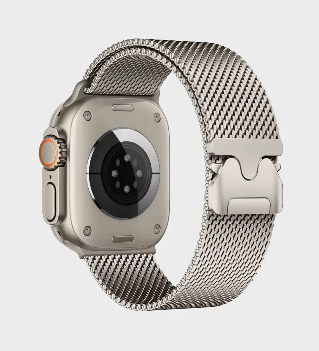 Está es una correa Milanese de titanio con un cierre estilo paracaídas, diseñada principalmente para el Apple Watch Ultra 2 y otros modelos de Apple Watch de gran tamaño y lo encuentras disponible en www.jendio.com